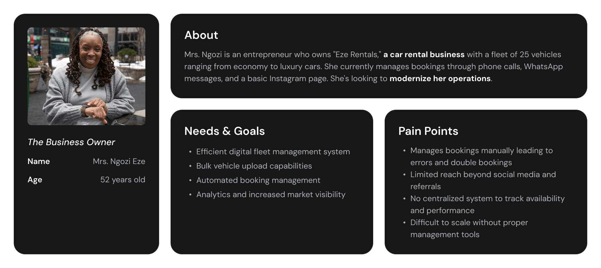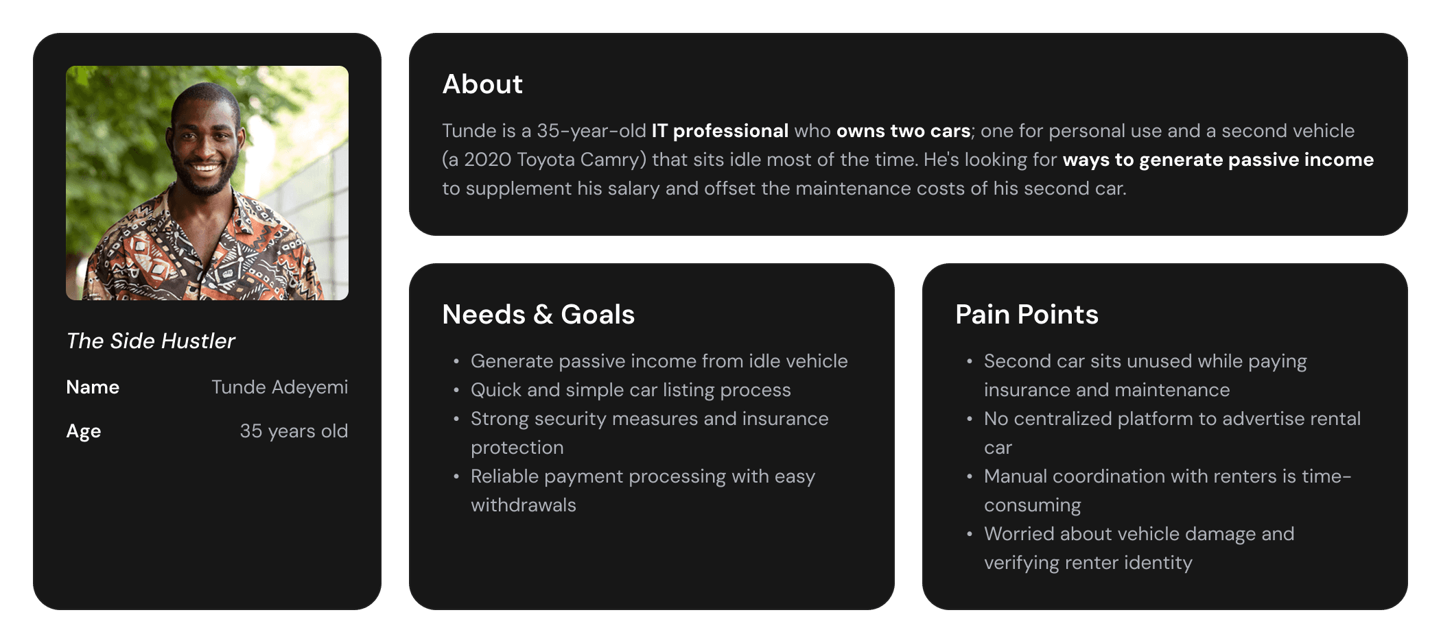 Through research and competitive analysis of platforms like Turo, Getaround, and local Nigerian rental businesses, we identified three primary user groups: