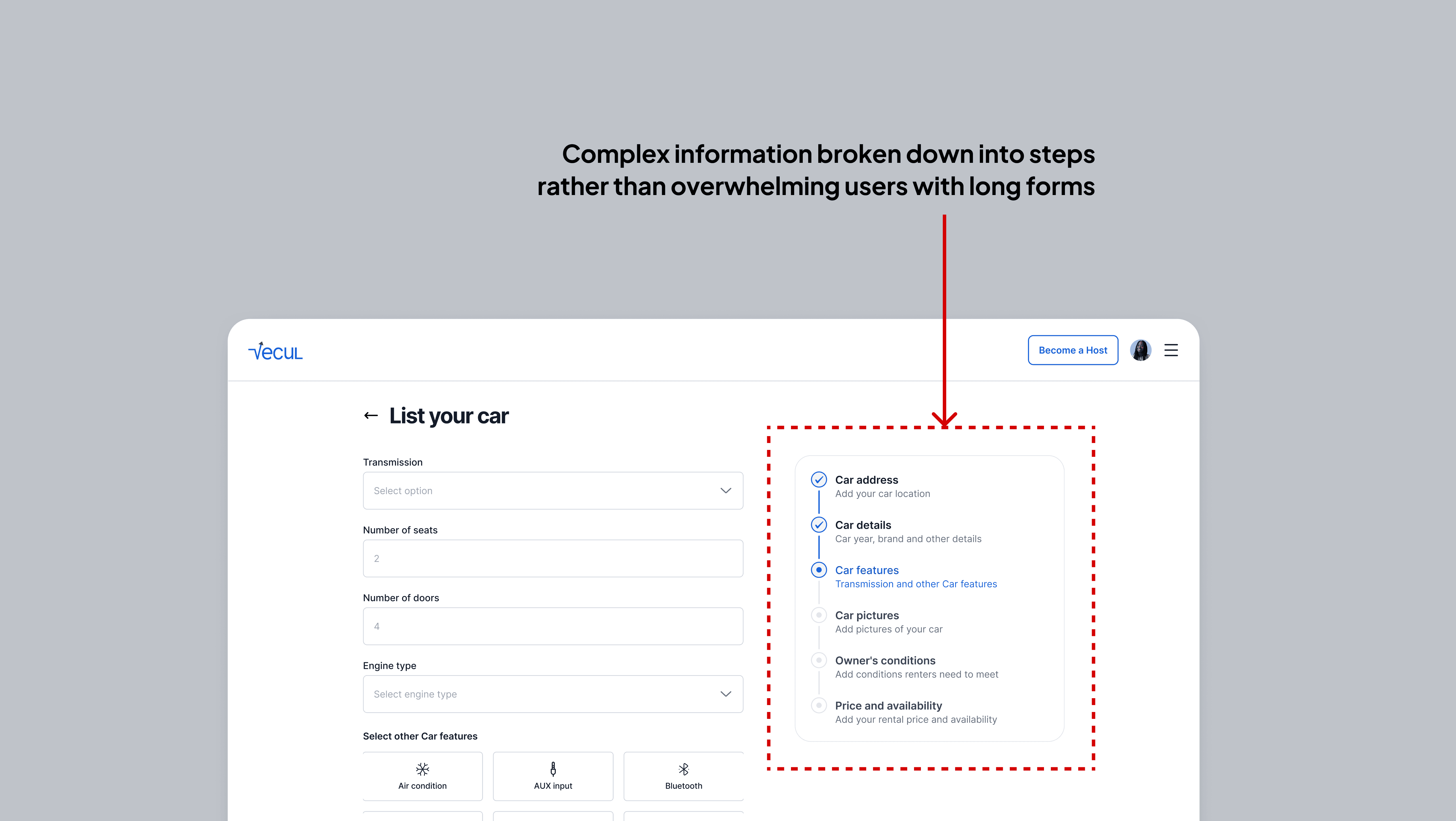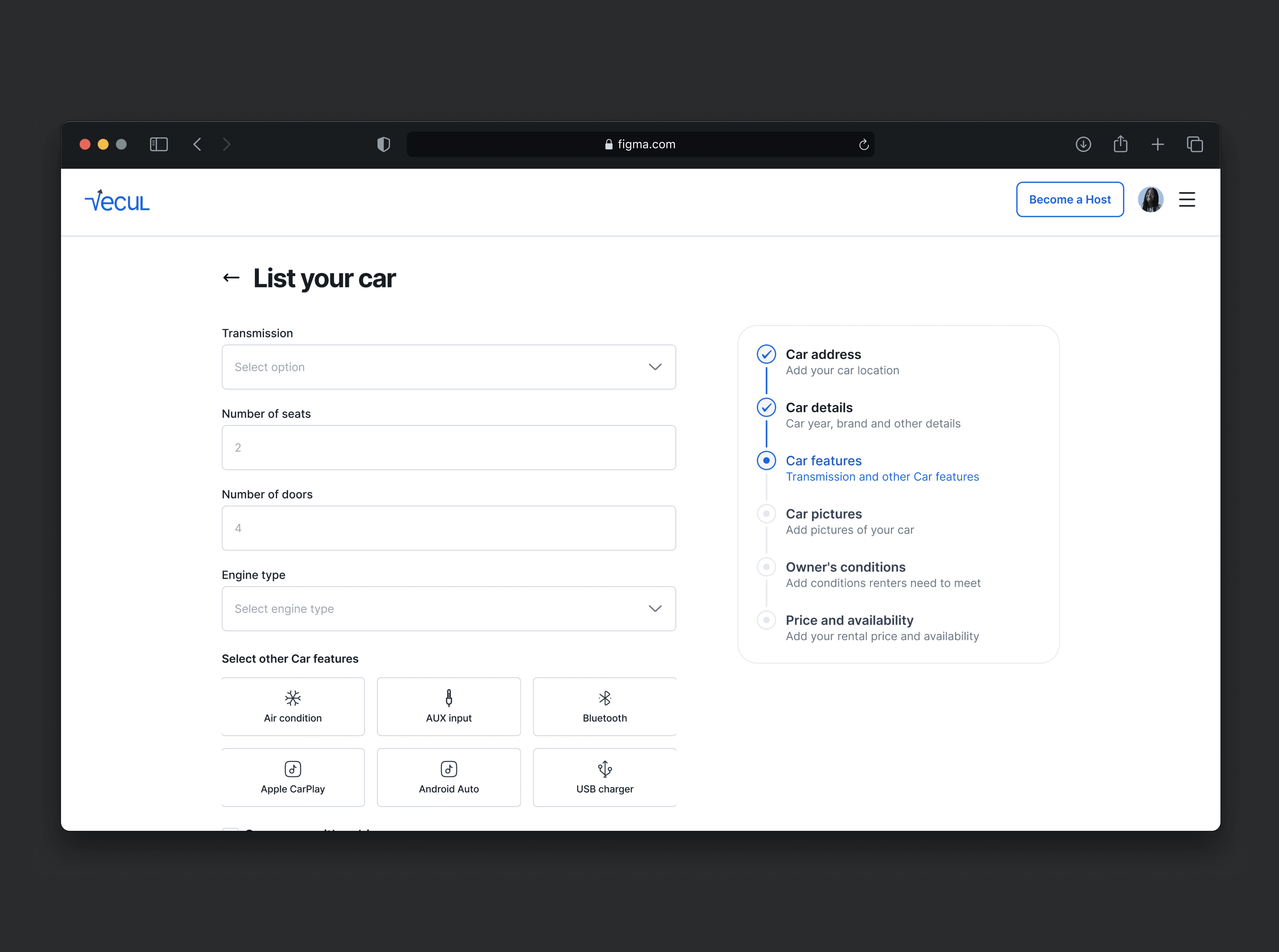Host onboarding uses a progress indicator to show users their position in the 6-step flow. Dropdown selectors organize vehicle specifications, while an icon-based grid allows quick feature selection (AC, Bluetooth, CarPlay, etc.). The driver option toggle addresses local market needs.